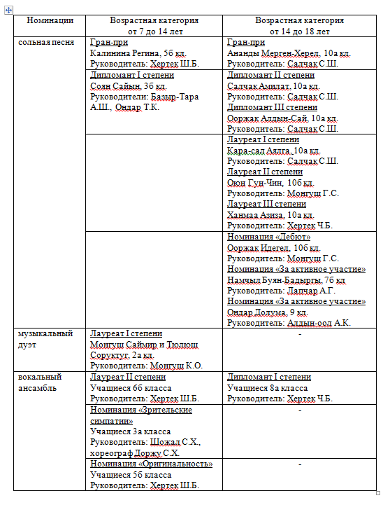 Итоги конкурса были торжественно озвучены на церемонии награждения директором ГДК Сафаровой Т.Ю. и заведующей художественно-постановочной частью Оюн Ч.А. 9 декабря 2020 года в актовом зале основной школы.