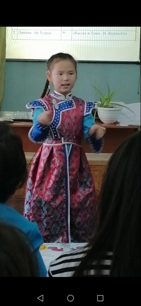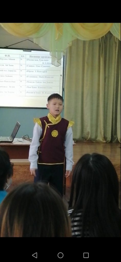 26 ноября в начальной школе проведен конкурс чтецов по теме «Моя Тыва», посвящённый 100-летнему юбилею образования ТНР. В мероприятии участвовали учащиеся 2-4 классов. Целью конкурса было воспитание положительного эмоционального отношения к литературным произведениям о Тыве, развитие у школьников художественно-речевых, исполнительских навыков при чтении стихотворений и выявление лучших чтецов среди детей. Дети отнеслись к мероприятию очень ответственно, хорошо знали тексты стихов. По сценарию играли в разные игры и показали хорошие знания о родной республике.