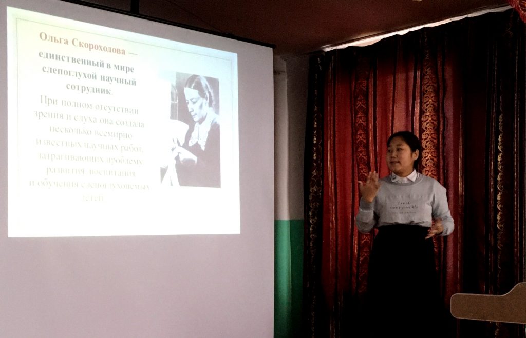 Среди слабослышащих учащихся 1 место — Донгак Аржаане, ученице 8 «а» класса. Она выступила с темой «Ольга Ивановна Скороходова». У Аржааны произношение было внятное, соблюдала ударение, интонацию, применяла жестовую речь, грамотно работала с аудиторией.
