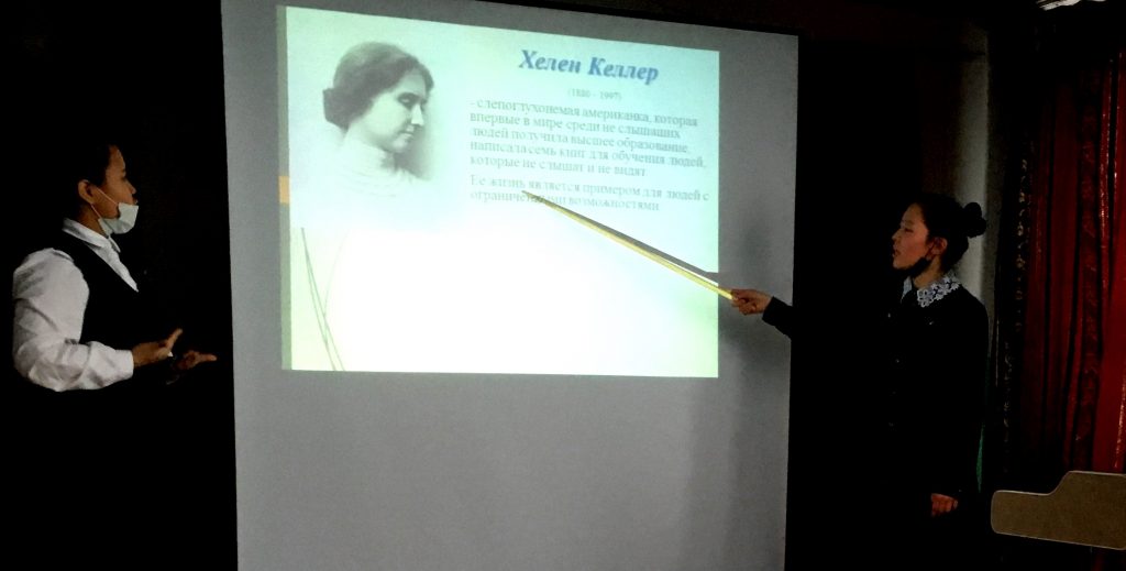 Среди глухих учащихся 1 место поделили между Кужугет Анастасией из 8 «б» класса и ученицами 9 класса Ооржак Алдын-Сай, Лопсан-Комбу Айда-Сай. Тема презентации Анастасии была «Чамыян Дженни Максимовна». Презентация красочная, соответствует требованиям. Тема связана с современной жизнью и деятельностью выпускницей нашей школы. А девочки 9 класса выступили с темой: «Хелен Келлер». Речь у Алдын-Сай была внятная, понятная для окружающих, старалась четко произнести свои критические звуки. А Айда-Сай выступила в роли сурдопереводчика. Они показали, что умеют работать с информационной технологией и презентовать ее на сцене.