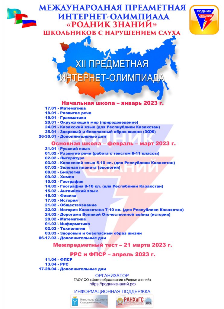 17 января 2023 года в начальной школе началась XII предметная интернет-олимпиада «Родник знаний» для школьников с нарушениями слуха. Олимпиада проводится дистанционно по предметам, представленным в учебном плане на основе адаптированных основных общеобразовательных программ начального общего образования для обучающихся с нарушением слуха. Организатором проведения Олимпиады является государственное автономное общеобразовательное учреждение Саратовской области «Центр образования Родник знаний» при поддержке министерство образования Саратовской области.