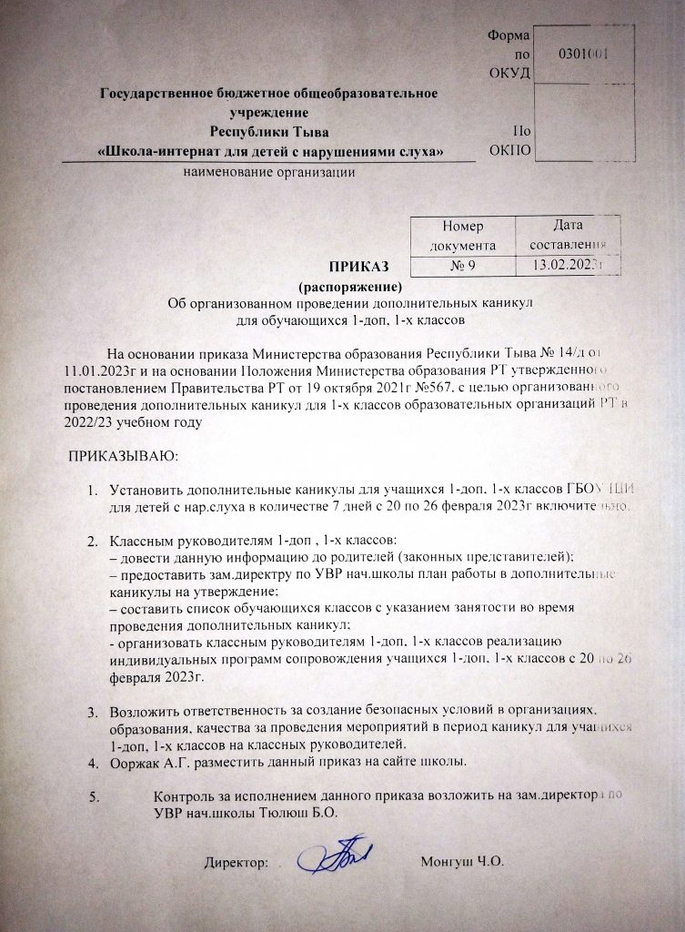 Новости школы Приказ об организованном проведении дополнительных каникул для обучающихся 1-доп, 1-х классов 14.02.2023 /