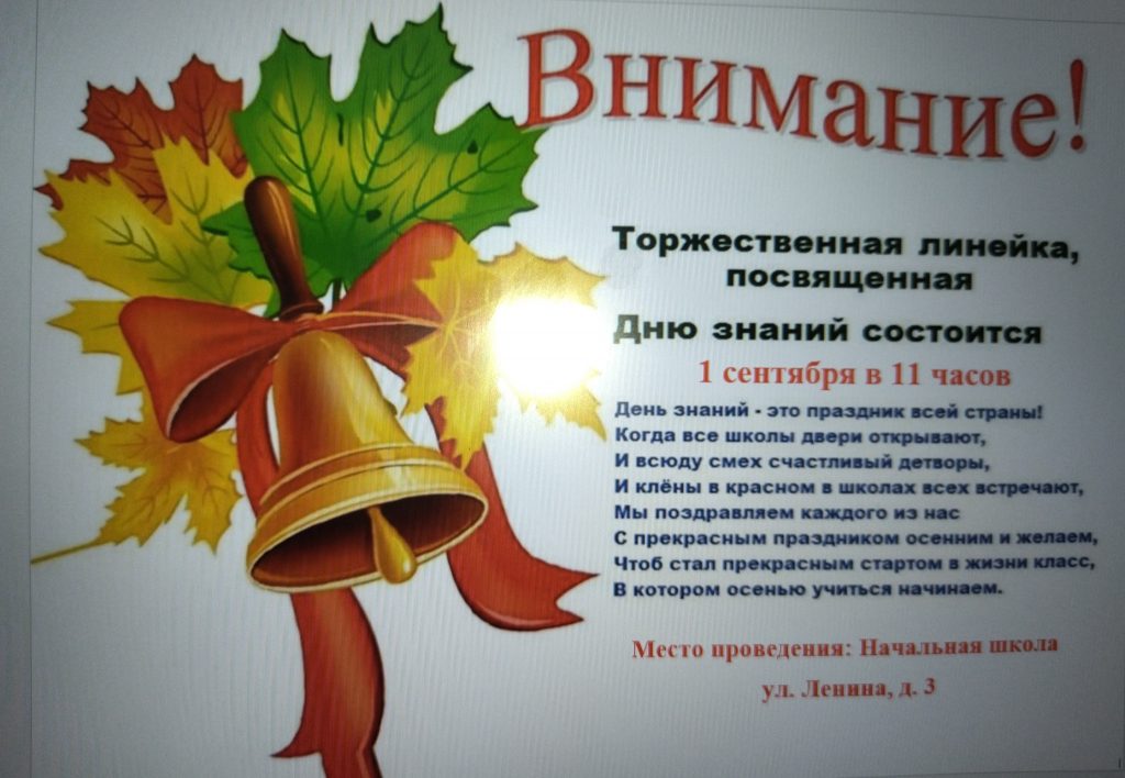 Новости школы Объявление «День знаний» 30.08.2023 / Внимание!Торжественная линейка, посвященная Дню знаний состоится 1 сентября в 11 часов.Место проведения: г. Кызыл, ул. Ленина, д. 3 (начальная школа).ГБОУ РТ «Школа-интернат для детей с нарушениями слуха».